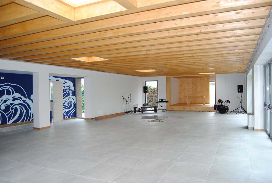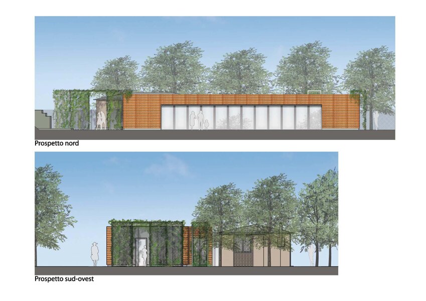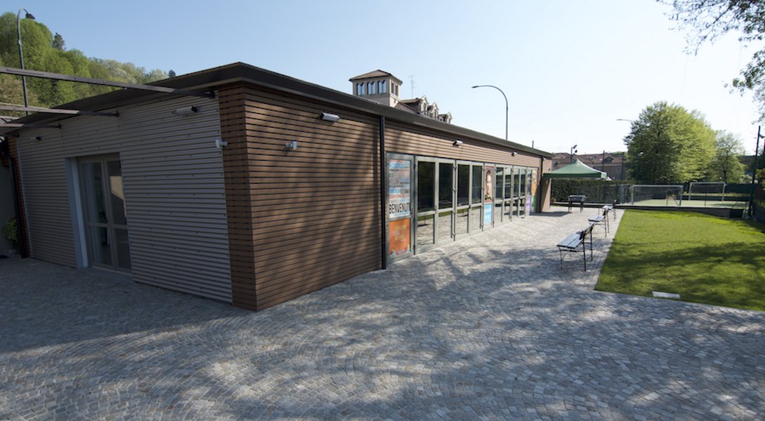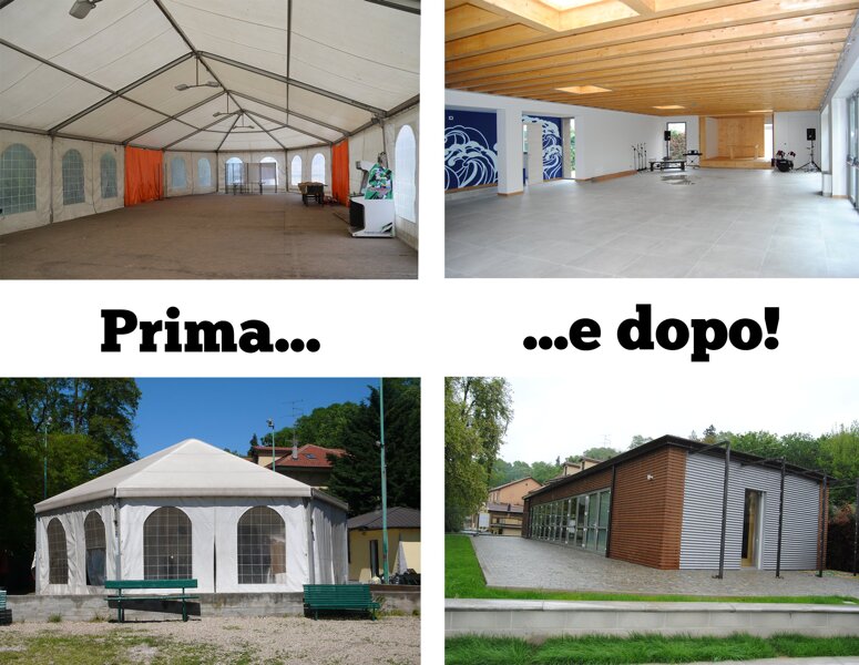 Nuovo padiglione polifunzionale con recupero di edificio esistente destinato ai servizi annessi.Area esterna attrezzata per manifestazioni all'aperto e attività sportive.