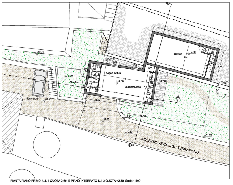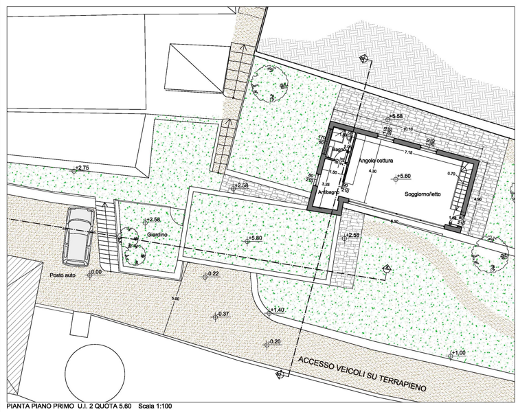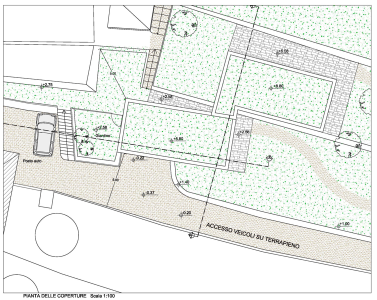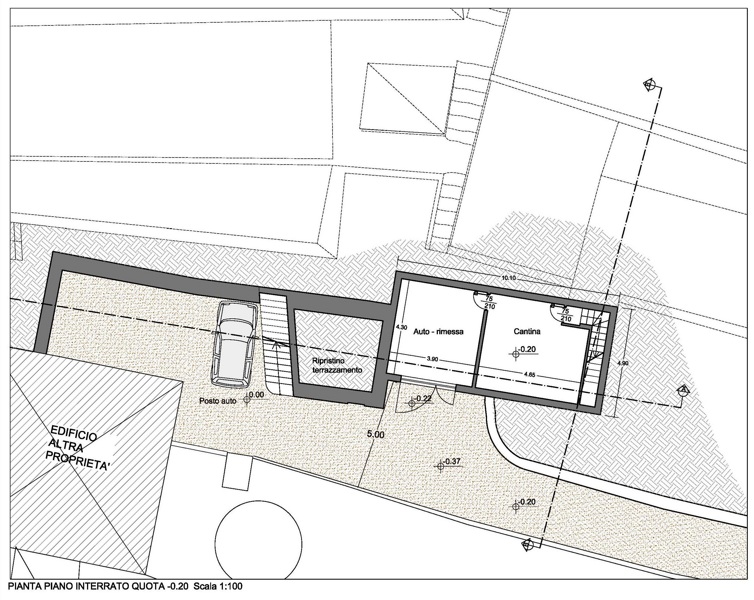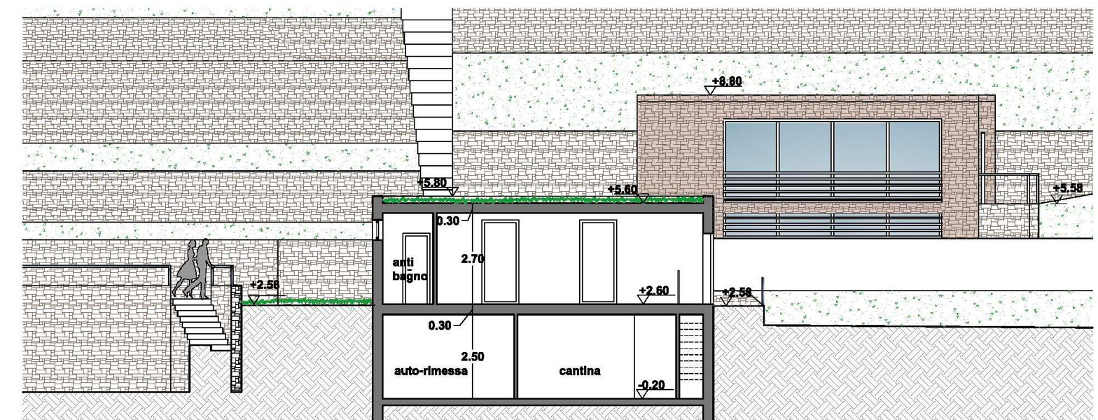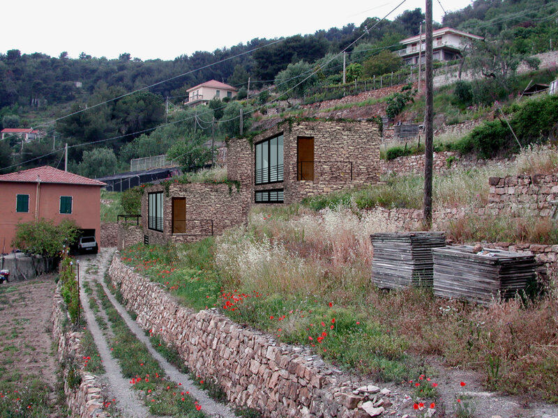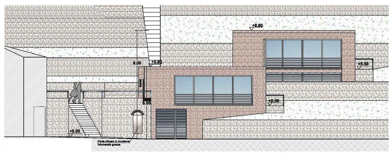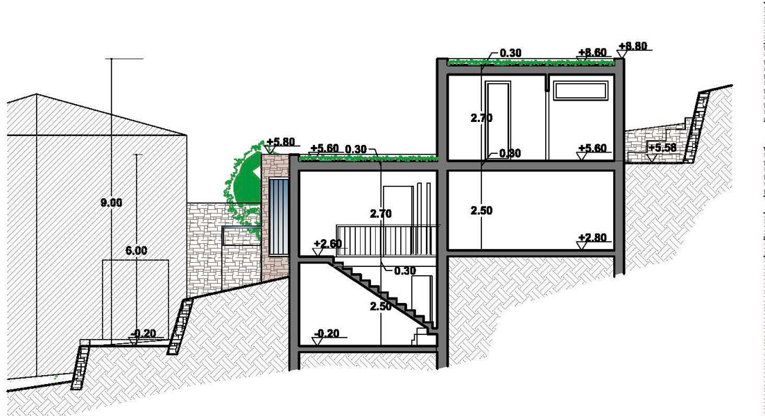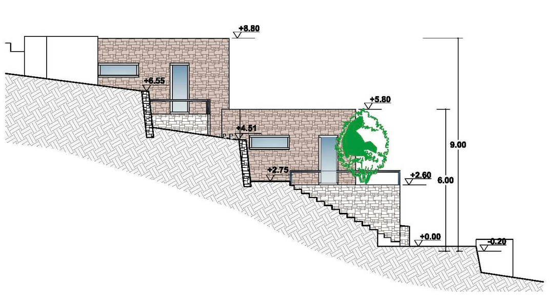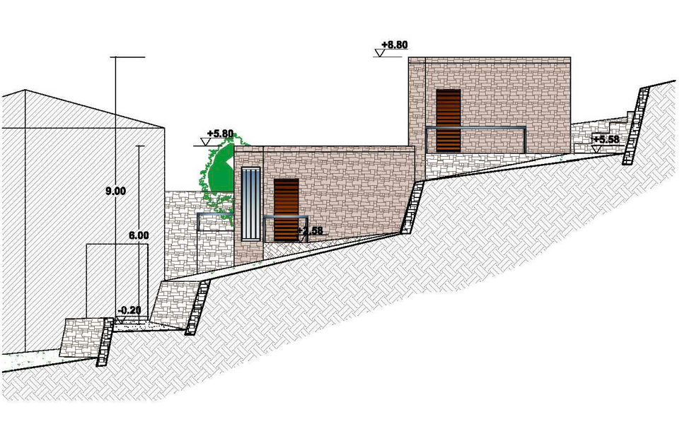 Demolizione di fabbricati fatiscenti e nuova costruzione, con recupero volumetrico di due abitazioni gemelle a piani sfalsati sui terrazzamenti esistenti.